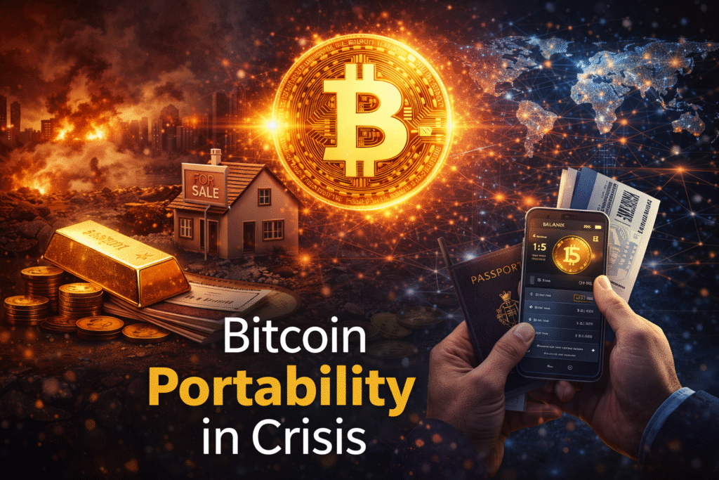 Bitcoin portability in crisis offers mobility, liquidity, and self custody when physical assets like land or gold become difficult to move.