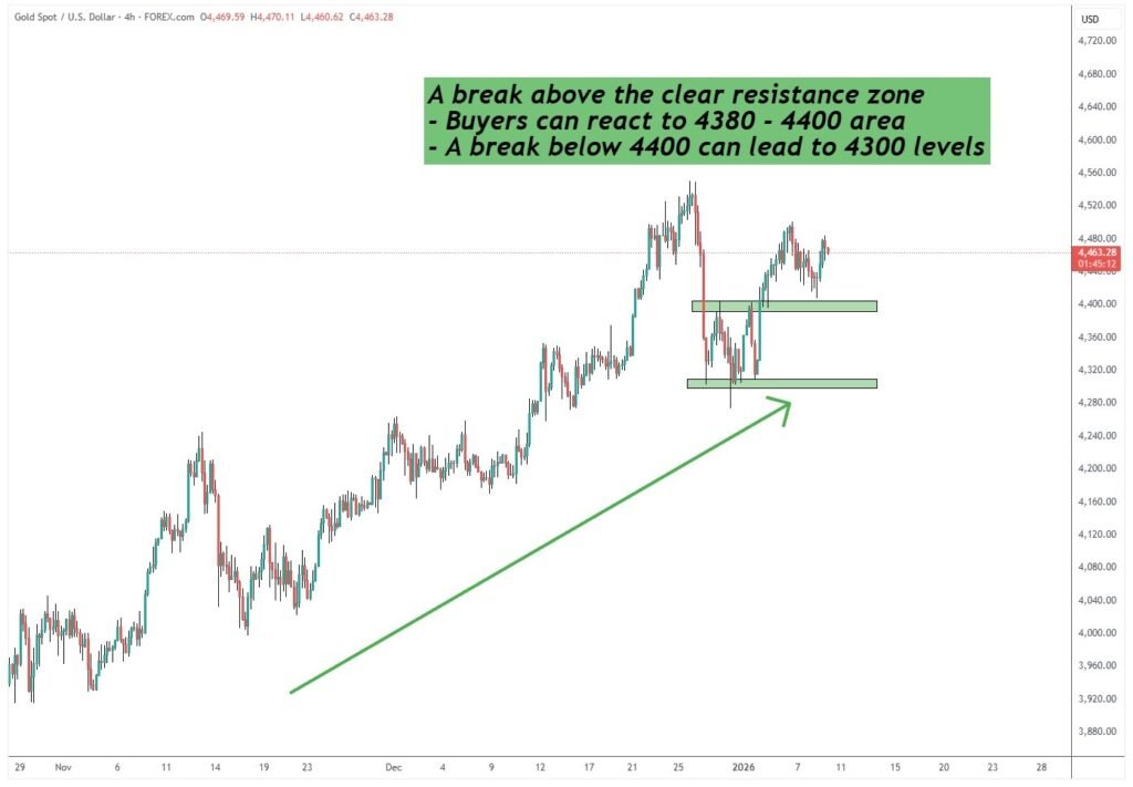 As long as price holds above the highlighted demand area, buyers remain in control. A clean reaction from support opens room for continuation toward the 4500 level. Failure to hold structure exposes price toward the 4300 region.