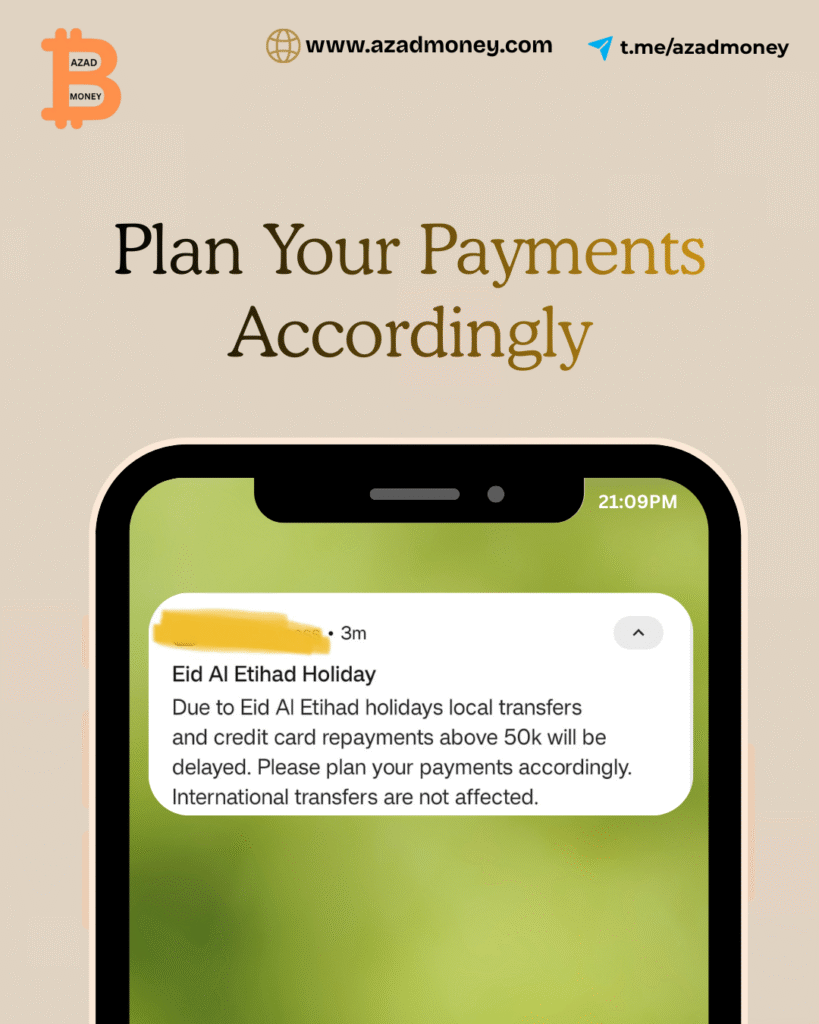 “Due to Eid Al Etihad holidays, local transfers and credit card repayments above 50k will be delayed.”